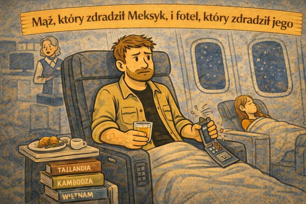 Przy odprawie biletowej, kiedy po wszystkich wcześniejszych perypetiach myślami byliśmy już dobre dziesięć, jedenaście godzin do przodu — w rozkładanym fotelu, pod kocykiem, z winem i poczuciem, że świat jednak bywa sprawiedliwy — czar nagle prysł. Okazało się, że fotel mojego męża w wyczekiwanej klasie biznes nie działa.